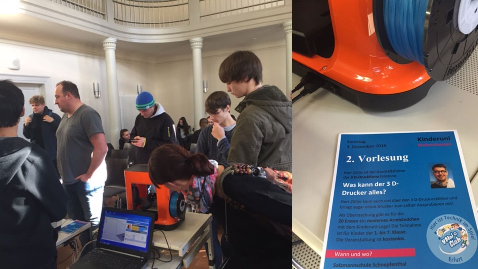 Immer unterwegs im Auftrag der Digitalisierung unseres Nachwuchses führte unser Weg uns am vergangenen Samstag zur Kinderuni nach Schnepfental. Ich, Steffen Zöller, Geschäftsführer der fabstone GmbH durfte gemeinsam mit meinen jungen Helfern Gunnar und Luca eine Vorlesung an der Kinderuni halten. Gemeinsam zeigten wir Möglichkeiten und anschauliche Beispiele für 3D-Druck im Klassenzimmer. Eine große Anzahl von Schüler der Klassenstufen 5 bis 12 lauschten unseren Vorträgen und diskutierten im Anschluss in einer lockeren Runde viele Fragen rund um die Additive Fertigung.